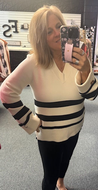 Charlie B Stripe V Neck Sweater - Ecru/Black